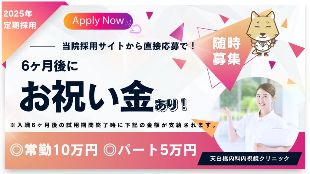 | お祝い金 | 当採用ホームページからの直接応募のみ対象 入職後6ヶ月の試用期間を無事に終了された場合、 お祝い金として10万円を支給いたします。 |